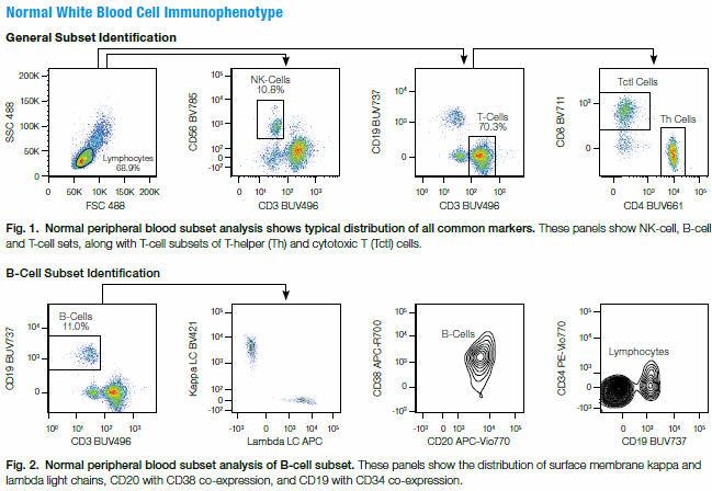 CD3 BUV496, CD4 BUV661, CD19 BUV737, TCRgd BUV395, CD8 BV711, CD45 VioGreen, CD56 BV785, Kappa Light Chain BV421, CD7-BV650, HLADR VioBlue, CD117 BV605, CD33 FITC, CD34 PE-Vio770, CD64 PE-CF594, CD11b PE, CD14 PE-Cy5, CD20 APC-Vio770, CD38 APC-R700, Lambda Light Chain APC