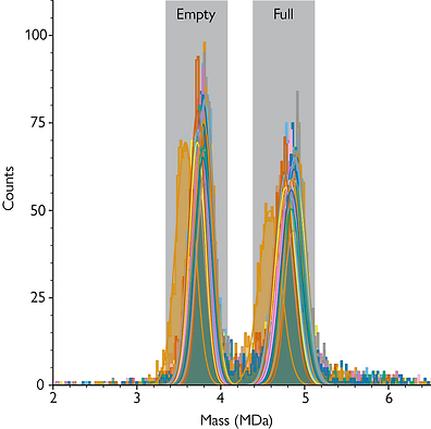 Fig. 1. The SamuxMP Auto offers autonomous and reproducible measurements. The mass histogram above shows the overlay of 22 measurements of different aliquots from the same AAV sample, illustrating the reproducibility of the measurements.