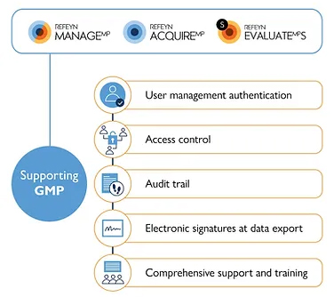 The software package supports compliance with the FDA 21 CFR 11 (US) and EU GMP Annex 11 regulations. It includes three applications: ManageMP, AcquireMP and EvaluateMPS.