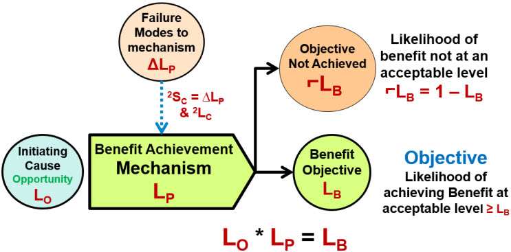The second type of risk is a “benefit risk” where the goal is to take an opportunity and maximize the likelihood of achieving the benefit. As shown in Figure 3, an initiating cause event enters a risk mechanism intended or designed to have a likelihood of at least LP of producing a beneficial objective. Most benefit risks are intentionally initiated (LC = 1), thus the likelihood of the benefit is LB = LP.