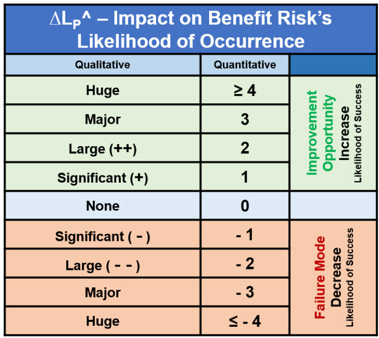 As shown in Figure 3, the acceptable success rate rating for a risk mechanism is LP^ when a benefit risk model is used. The success rate is impacted by failure modes that decrease LP^ and modifications or improvement opportunities that increase LP^. A quick table for thinking about and approximating the change in LP^ for a benefit risk from failure modes or improvement opportunities is shown in Table 2.