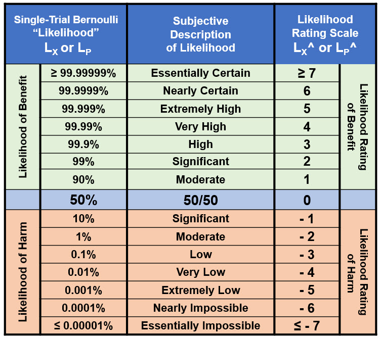 The likelihood ratings in Table 1 provide a universal method of evaluating and communicating likelihoods. Concisely handling the likelihood of harm risks is straightforward because they are all less than 50%. For a sequence of harm risk mechanisms, the ratings LX^ = Log10(LX) means the likelihoods can be multiplied by adding the logarithmic ratings.