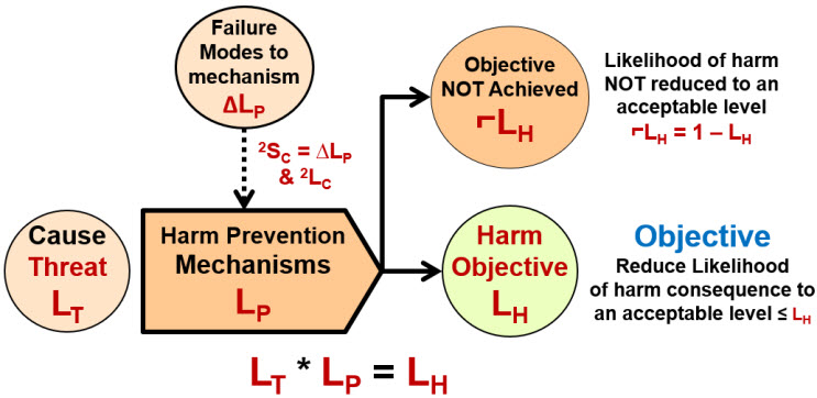 The relationship in Figure 1 describes two fundamentally different types of risks. The first is a “harm risk” where the mechanism is used to minimize the likelihood of the consequence effect event’s occurrence. As shown in Figure 2, the objective of a harm risk mechanism is to minimize the occurrence of the harmful outcome to at least an acceptable likelihood of ≤ LH.
