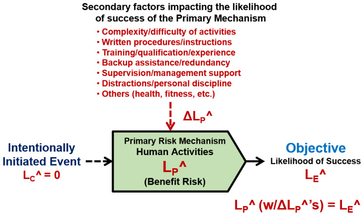 The list of secondary factors for human activities is very large and may vary widely from one person to another. The list shown in Figure 4 contains some of the more obvious factors that can be considered when evaluating the likelihood of success LP^ of the human contribution to the mechanism’s success. If LP^ is not acceptable in the view of the analysis team, then the primary mechanism can be modified to improve its success rate by identifying and controlling the likely significant failure modes or identifying and implementing important opportunities.