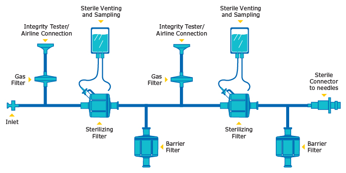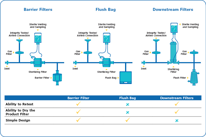 There are two options for a downstream filter arrangement. The first is barrier filters which contains both hydrophobic and hydrophilic membranes. These sterilizing-grade filters allow an unlimited volume of water to be flushed through the hydrophilic membrane, while the hydrophobic membrane allow the pre-use integrity test to be performed without compromising sterility of the downstream side of the filter arrangement. This filter also enables blow-down of the sterilizing-grade filter. 9,10