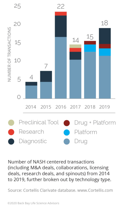 - With a flurry of deal activity in NASH during the 2016-2017 timeframe, recent clinical setbacks may have a cooling effect on the deal-making. However, approval and success of OCA could reinvigorate the deal space as commercial entities look for a fast follower advantage.