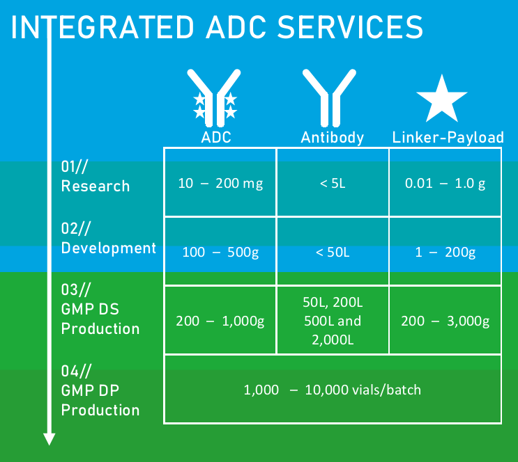 By leveraging the existing mature protein drug manufacturing and analysis technology platform, Mycenax combines antibody and small molecule drug technology to expand its CDMO services into the ADC field. Mycenax and strategic partners offer a comprehensive one-stop ADC service, covering the process development from antibody modification, small molecule drug synthesis, biochemical conjugation, to analysis, characterization, and PIC/S GMP production, and provide customers with effective assistance in ADCs development.
