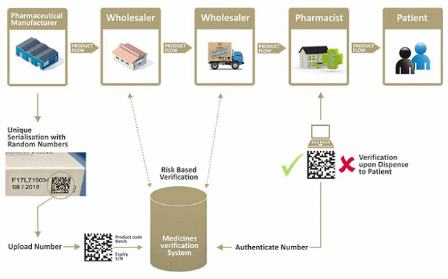 The end-to-end serialization model requires the manufacturer to print the UI on each saleable unit and then upload that UI to European repositories at one end of the supply chain. Then, at the other end — the point of dispense of the product — the UI and the tamper evidence device are verified by the pharmacist against the European repositories. If the UI is found to be verified correctly, it is then dispensed and turned off in the repository.