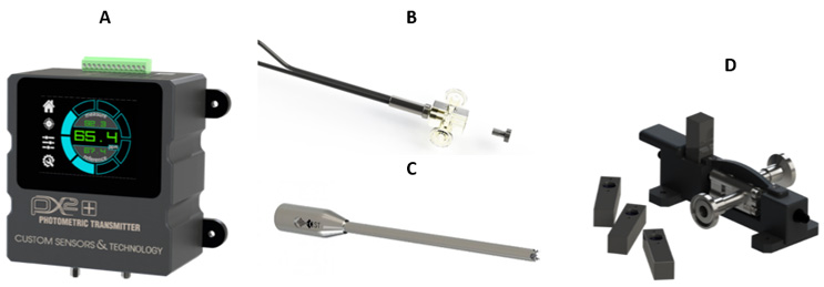 Custom Sensors and Technology’s various PAT solutions include its PX2+ Photometer (A), its single-use fluorescence flow cell (B), insertion Probe (C), and absorbance EZ-CAL flow cell (D).