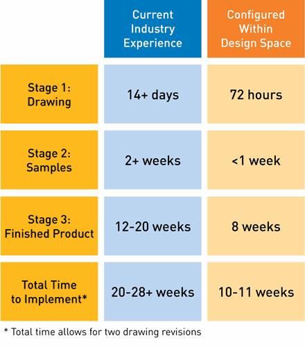 Using the design space concept for a configured solution offers significant speed benefits. The figure below illustrates the speed gained with using the design space. The drawing and price would be available within 72 hours, with further revisions taking another 72 hours. Samples could be provided within a week. Finished products would be available in about eight weeks. The design space concept takes 10 weeks in total, and results in significant time savings compared to a customized solution.