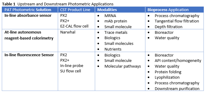 Table 1 summarizes the established applications for robust photometric PATs along with the Custom Sensors and Technology product lines. Most of the applications exist in downstream unit operations, but the upstream opportunities are also attractive and well established in the scientific literature. Integrating aggregated photometric sensors and at-line analyzers across upstream and downstream biomanufacturing unit operations forms a more robust strategic approach as they are more cost-effective and efficient to implement and sustain to enable advanced process control and continuous process verification, to thereby cultivate a desired QbD design as part of an effective quality program.