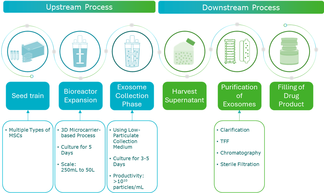 - A downstream process for exosome purification through ultracentrifugation has been established; the scalable downstream processes using TFF and chromatography are under development.