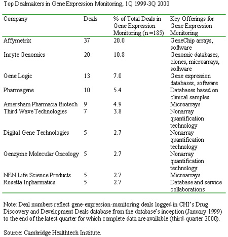 Furthermore, gene expression monitoring has been the focus of a high level of dealmaking, indicating strong interest in this field. According to CHI's Drug Discovery and Development Deals Database, gene expression monitoring represented one of the two most active categories of deals (based on CHI's technology codes) in 1999, accounting for 19% of all deals last year. (The other most active class was bioinformatics, also accounting for 19% of deals.) In the third quarter of 2000—the most recent quarter for which complete statistics are available—this technology was the focus of 43 deals, compared with 19 such deals in the same quarter of 1999. Since the inception of CHI's database in January 1999, 185 gene-expression-monitoring deals have been logged.