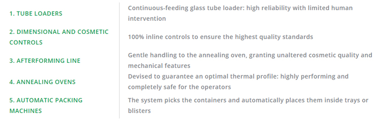 Stevanato Group vial forming lines come in a variety of specifications that vary depending on the production requirements. By maintaining close ties with the customer throughout every step of the process, we can design and manufacture fully tailored, purpose-built equipment capable of producing vials with entirely custom dimensions and shape.