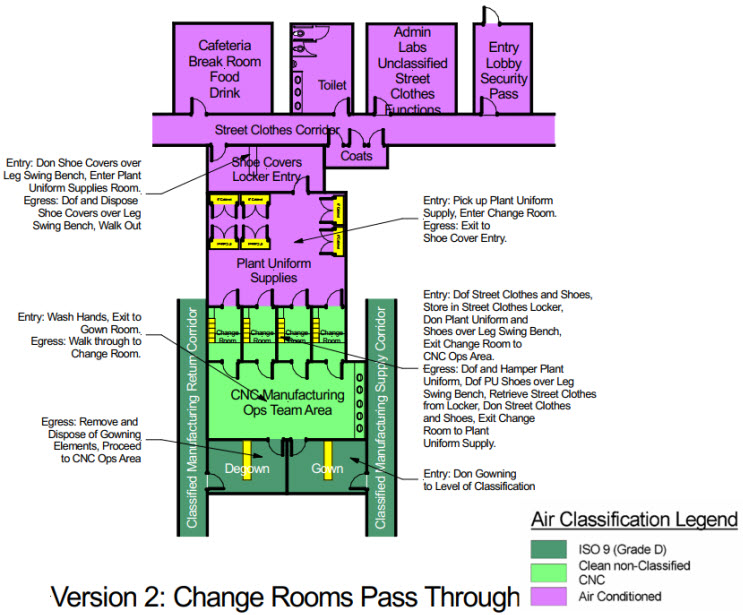 While generally comprising the same procedural steps, each of the examples discussed and diagrammed varies significantly in performance when it comes to minimizing residual contaminants from external sources carried over into the GMP controlled manufacturing environment. The sequential and directional flow alternatives, whether gender common or segregated, provide a higher-performance outcome and a protective effect on GMP controlled manufacturing environments.