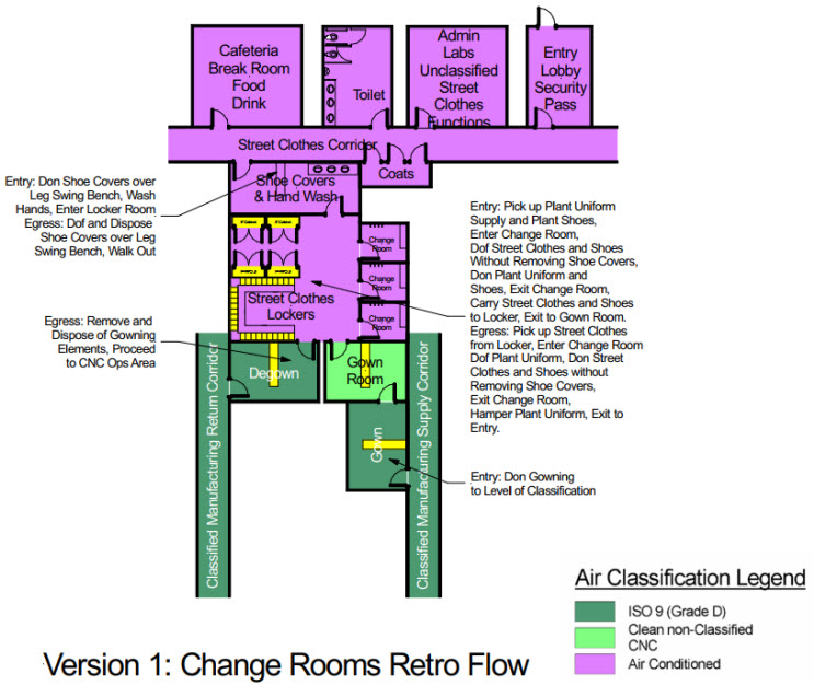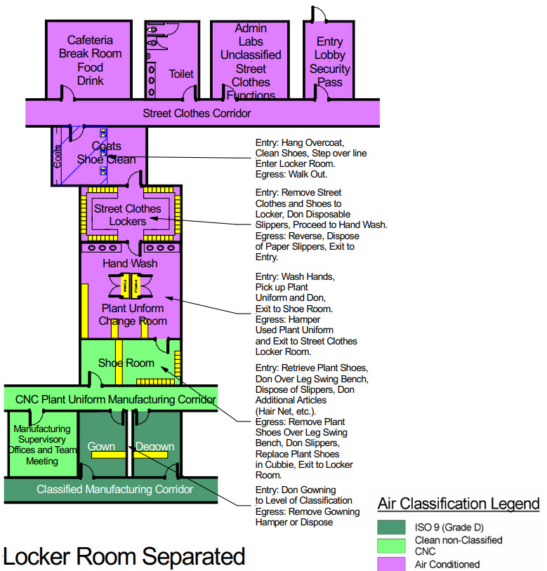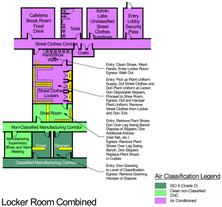To facilitate discussion, several diagrammatic examples of plant uniform locker rooms and procedural sequences are included below. Each is based directly on a built, licensed facility in GMP operation.