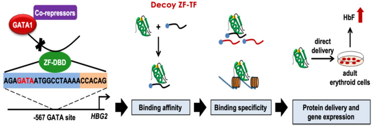 Figure 1: Schematic representation of decoy zinc finger DNA-binding peptide (ZF-DBD)-mediated reactivation of fetal hemoglobin (HbF) expression in human erythroid progenitor cells.