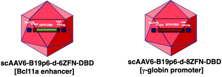 Therefore, we reverse engineered the decoy ZF-DBD peptide amino acid sequence into DNA, placed it under the B19p6 promoter, and packaged it into AAV6 vectors. As a matter of fact, we generated two such vectors, shown schematically in Figure 2: the 6-decoy ZF-DBD peptide expressing gene targeting the Bcl11a enhancer and the 8-decoy ZF-DBD peptide expressing gene targeting the human g-globin gene promoter sequences under the control of the human erythroid cell-specific B19p6 promoter (unpublished data). Thus, sustained and erythroid lineage restricted expression of these peptides promises to be a safe and effective strategy to achieve gene editing.