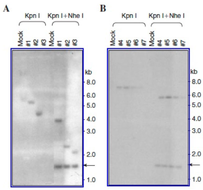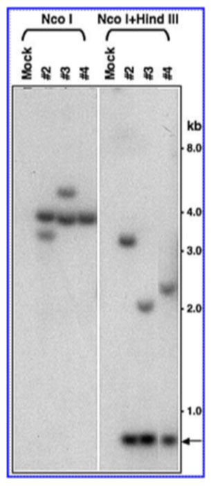 We tested this hypothesis, albeit using mouse HSCs, in two sets of serial stem cell transplantation studies. In the first set, we documented that following ex vivo transduction, the recombinant AAV-human b-globin vectors mediated sustained transgene expression in bone marrow progenitor cells for up to six months, suggesting stable integration of the vector DNA sequences in primary transplant recipient mice. Six months post-primary transplantation, HSCs from primary recipient mice were isolated and transplanted into lethally-irradiated secondary transplant recipient mice. Three months post-secondary post-transplantation, genomic DNA isolated from bone marrow cells were analyzed by Southern blot analysis (Figure 3), which corroborated stable integration of the AAV vector genomes in bone marrow progenitor cells.24