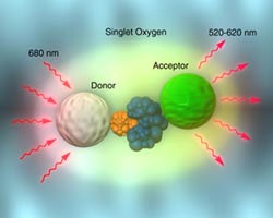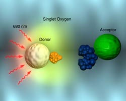 AlphaScreen assays are based on the photochemical interaction of two types of beads, each conjugated to a biomolecule that is specific to the assay being performed. The first bead (donor) absorbs red light and generates singlet oxygen molecules (see figure 1). The singlet oxygen molecules are only absorbed by the second bead (acceptor) if it is in close proximity to the donor bead (see figure 2). Upon absorbing the singlet oxygen, the acceptor bead emits light at a lower wavelength for an extended period of time. This permits the use of time-resolved counting technology, which eliminates artifacts due to sample and plate background.