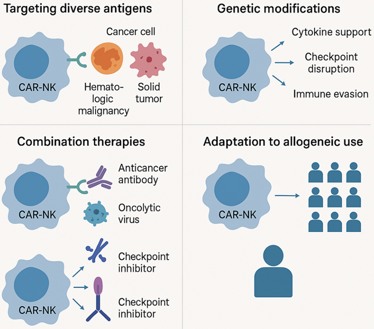 This figure highlights four major advantages of CAR-NK cell therapy in cancer treatment. First, CAR-NK cells can effectively target a variety of tumor antigens, including those from hematological malignancies and solid tumors. Second, genetic modification enhances its therapeutic potential through cytokine support, immune checkpoint disruption, and immune escape. Third, CAR-NK cells can be used in combination with other therapies, such as anti-cancer antibodies, oncolytic viruses, and checkpoint inhibitors. Finally, its allogeneic adaptability enables it to be applied to a wide range of patient populations through a single engineered cell source.