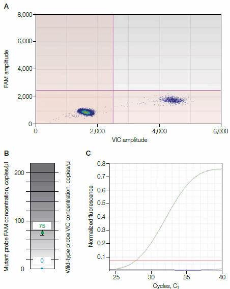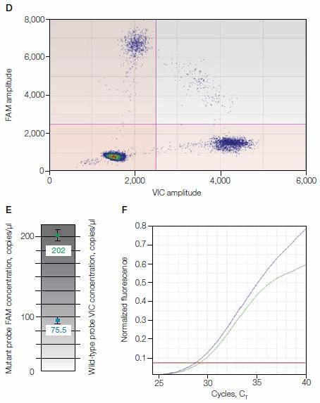 Kristof J et al. (2012). Non-invasive absolute quantification of EGFR activating mutation L858R and gatekeeper mutation T790M in NSCLC plasma samples using Droplet Digital PCR. Eur J Cancer 48, S139–S140. FAM and VIC are trademarks of Applera Corporation.