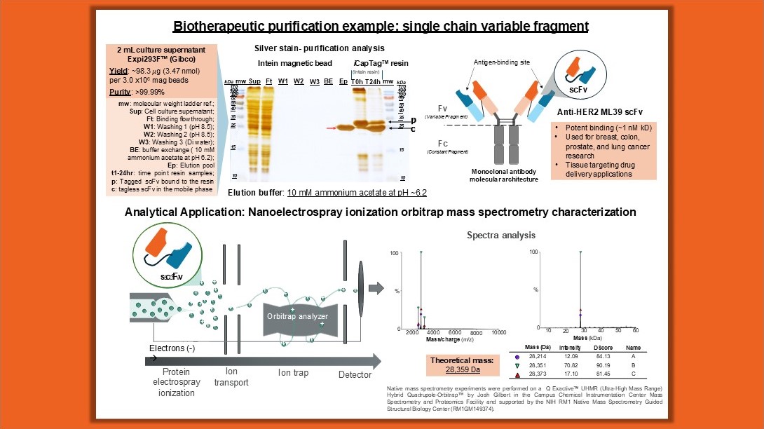 Our lab used this technology to generate tagless ML39 scFv, a ~28 kDa potent anti-HER2 chimeric single chain variable fragment for cancer research and other drug delivery applications. The intein-tagged scFv was successfully secreted into the culture media through selected signal peptide sequences as a strategy to simplify the sample processing and reduce the host-cell impurities. We used the developed intein magnetic beads to capture the scFvs directly from the culture supernatant. This method allowed the cleavage and release of scFvs without tags directly into mass spectrometry (MS)-compatible buffers for immediate nanospray ionization MS analysis, proving highly effective buffer exchange capabilities and analytical feasibility.
