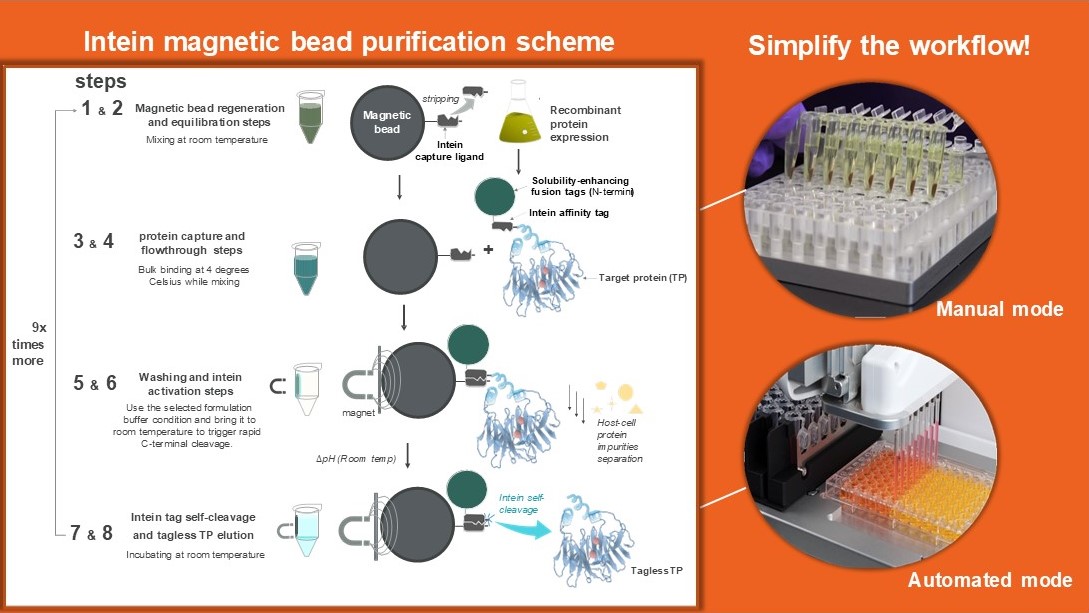 A significant breakthrough in addressing this need is the integration of magnetic bead bioseparation platforms with self-cleaving inteins, resulting in a novel method for the rapid purification of challenging target proteins. Using inteins on a magnetic support provides several advantages by reducing downstream processing complexity, lowering costs, and accelerating the isolation of tagless therapeutics, all with a simple and efficient setup. The intein-based magnetic bead system enables effective affinity capture, tag removal, and buffer exchange, supporting direct analytical applications to meet the fast-paced demands of drug development.
