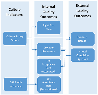 Actual ROI values must be calculated from actual business results. As such, the metrics and their definitions should be aligned to business results, the definitions must be agreed upon, and these metrics should be consistently collected and reported to support ROI calculation. The metric collection and reporting effort for business results typically requires resources beyond the training department. As many business results are related to quality outcomes, participation of the QA organization is anticipated. The ISPE Quality Metrics Initiative suggests a new quality metrics program start with a small number of clearly defined targets to make the process manageable and more likely to succeed. In this example, two culture indicators were selected (culture survey scores and corrective and preventive action [CAPA] with retraining) which were found to be statistically significant to quality outcomes, as shown by arrows in Figure 1.