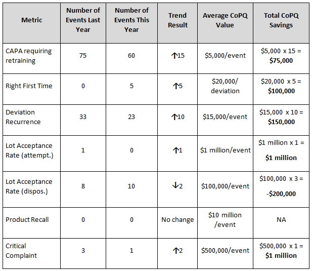 Table 2: Example Annual Metric Trend Results and CoPQ Savings