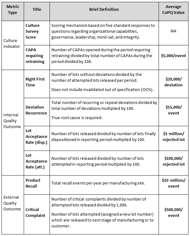Table 1: Example Metric Definitions and Estimated CoPQ Values