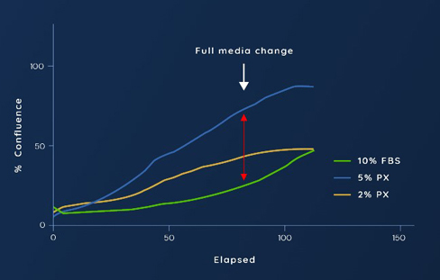 Physiologix can support proliferation in other cell models such as mesenchymal stem cells (MSCs). DMEM/F-12 media supplemented with Physiologix (PX) have increased cell proliferation rates at earlier time points (compared to FBS) resulting in shortened protocols, which could reduce labor and consumable costs, lower energy consumption, and accelerate therapy delivery without affecting the quality of the cells.