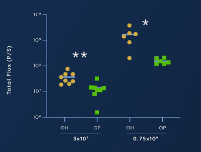 Physiologix can improve the therapeutic potential and in-vivo efficacy of CAR T-cell therapy by promoting a more potent antitumor response. In data published by UPenn and Nucleus Biologics, anti-GD2 CAR-T cells expanded in OpTmizer™ + 2% Physiologix (OP) demonstrated significantly superior tumor killing in an in-vivo solid tumor neuroblastoma model when compared to CAR-T cells grown in OpTmizer + 5% human serum (OH). Data shows quantification of tumor burden in total flux (photons/second) by bioluminescence imaging on days 15 (3×10⁶ CAR-T cell dose) and 19 (0.75×10⁶ CAR-T cell dose).