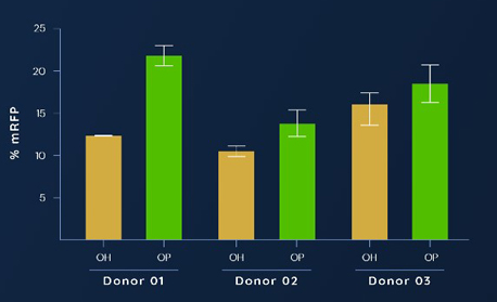 Physiologix promotes viral entry and enhances lentiviral-mediated gene expression. As shown, media supplemented with 2% Physiologix (OP) demonstrate significantly enhanced transduction efficiency measured as % expression of red fluorescent protein (RFP) (compared to 5% human serum (OH)), resulting in a greater proportion of transfected cells and, in turn, a higher potency final product at lower manufacturing costs. Data shown represents 3 donors using Optimizer™ media in a G-Rex® model.