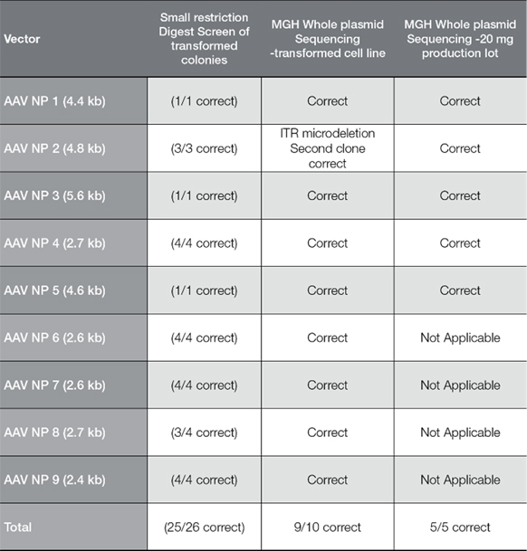 Nanoplasmid’s small backbone (<500bp) and antibiotic-free selection system is designed for cell and gene therapy applications. Its manufacturing benefits include improved plasmid yields as compared to conventional plasmids (Figure 1) and ITR stabilization from the proprietary host strain used to manufacture Nanoplasmid (Figure 2).
