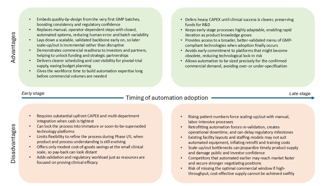 The huge variety of therapeutic areas being targeted and of manufacturing processes being developed adds complexity to the decision: a high-throughput autologous CAR-T cancer therapy facing thousands of batches per year will highly benefit from automating labor-intensive steps such as cell expansion, whereas a low-volume gene-modified therapy for a rare disease can tolerate more manual touchpoints and defer heavy CAPEX.