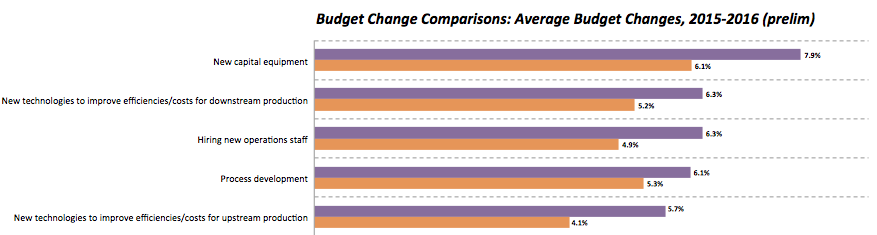 Biomanufacturers also look to be spending more on innovation this year, hiking their budgets by around 6% for new technologies to improve efficiencies and costs for both downstream (6.3%) and upstream (5.7%) production.