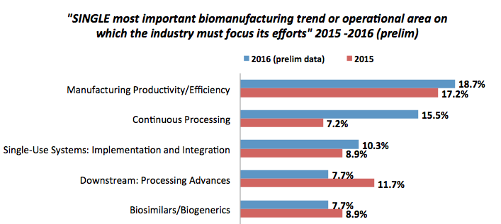 In fact, continuous bioprocessing was cited as the top trend in the industry today by more than double the share of respondents as last year2 (15.5% vs. 7.2%).