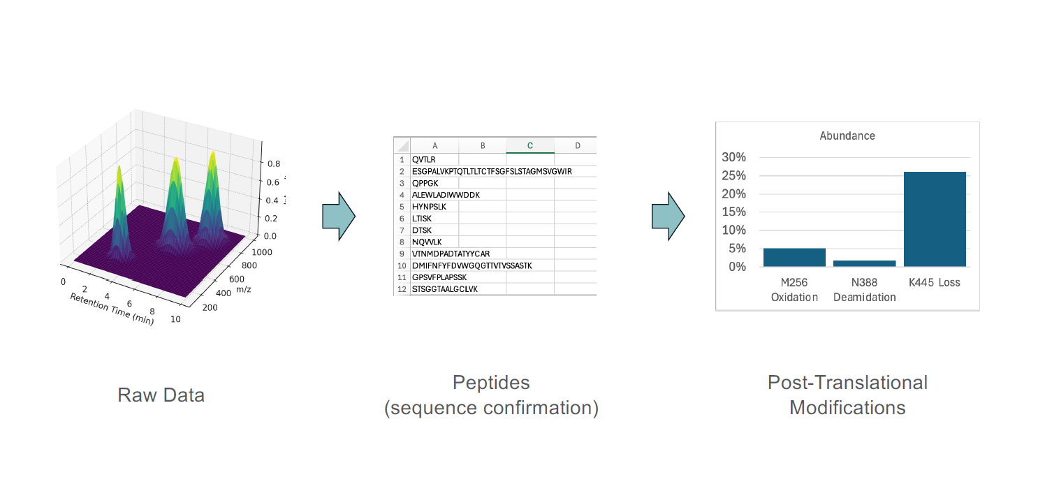 The characterization of biologics encompasses detailed analysis of their physicochemical properties, including structural integrity, glycosylation patterns, aggregation status, purity, potency, and immunogenicity. Analytical platforms such as mass spectrometry, chromatography, electrophoresis, and bioassays generate complex data sets that require expert interpretation, often through several layers of software. For example, an LC-MS experiment has raw data that is composed of retention time, m/z, and intensity. The raw data tends to be very large and not very informative on its own. It needs to be contextualized and go through a software stack to identify the peptides and proteins that were contained in the sample, as illustrated in Figure 1. Most of the time, we are not interested in the peptides and proteins but in the post-translational modifications (PTMs) on specific amino acids. Therefore, another step of data processing is often necessary.