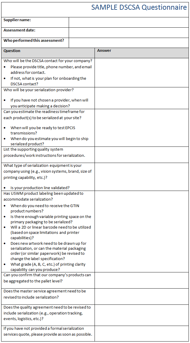 - Each CMO/packager and 3PL completes a serialization questionnaire and provides a quote outlining the cost impacts of adding serialization to the product.