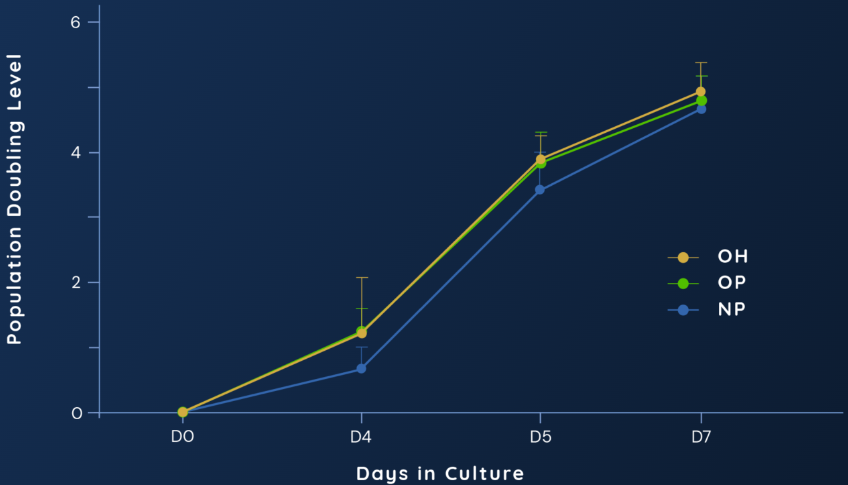 NB-ROC + 2% Physiologix (NP) supports strong population doubling equivalent to OpTmizer™ + 5% Human Serum (OH) and OpTmizer + 2% Physiologix (OP). Proliferation, cell health, viability, and maintenance of relevant phenotypes (assessed but not shown) are also comparable. Data shown represents average of 3 donors ±SD in a G-Rex® model.