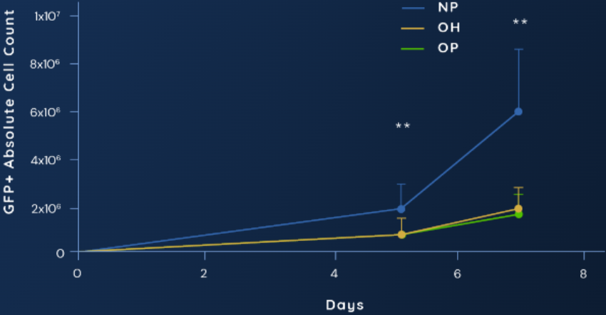 NB-ROC increases efficacious cells in your process. Using GFP as a marker of lentiviral transduction, NB-ROC + 2% Physiologix (NP) shows significantly higher numbers of transfected cells compared to OpTmizer™ + 5% Human Serum (OH) and OpTmizer + 2% Physiologix (OP) after 7 days of culture. Data shown represents average of 3 donors ±SD in a G-Rex® model.