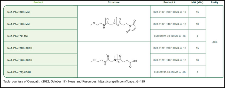pSar bioconjugation involves attaching pSar chains to therapeutic molecules, such as proteins or nanoparticles.3 pSar is a biocompatible, synthetic hydrophilic polymer composed of repeating sarcosine units. Its unique structure allows it to interact with biological molecules while minimizing immunogenicity and clearance by the body's immune system. This modification can improve the drug's pharmacokinetics and biocompatibility, as PSARylation exhibits excellent water solubility and biostability. Its high-water solubility and low toxicity, combined with the ability to reduce the clearance of drugs from the bloodstream, makes PSARlyation a promising option to improve the therapeutic efficacy of various compounds.3 pSar bioconjugation is gaining traction as a valuable strategy to overcome the limitations of PEGylation, and it holds great promise in the development of advanced drug delivery systems. Some available pSar polymer conjugates on the market (shown in the Table) include Curapath’s monofunctional MeA-PSar(200)-Mal and MeA-PSar(200)-COOH and bifunctional Azide-PSar(200)-COOH and Azide-PSar(200)-NHS.4