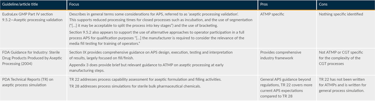 In addition to regulatory and industry guidance, which primarily focuses on APS for conventional drug product filling, there are some specific information sources on approaches to APS for ATMPs. Table 1 provides a summary (extract only) of each regulation or guidance and highlights how it either supports the APS approach for ATMPs space or provides challenges.