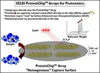 The ProteinChip Array contains hundreds of multiple, addressable locations of chemically or biologically defined protein binding surfaces arranged as wells of 1mm diameter or smaller. The arrays contain various kinds of functional groups—from antibodies and receptors to chromatographic surfaces—to capture proteins. Minute quantities of samples such as serum, urine, or tissue extracts, can be incubated directly on the chip, without having to purify the proteins first. After the chip has had a chance to bind molecules in the sample, and unbound material is washed away, it is treated with short bursts of laser light, releasing and ionizing the proteins, which are accelerated to a detector. The time-of-flight required for proteins to reach the detector is calculated to determine the molecular weight of each released protein. The result is graphically displayed as a protein profile of all captured proteins from a particular sample. The ability to use multiple array surfaces amplifies the ability to rapidly define complex protein compositions by simultaneously investigating a variety of purification conditions.
