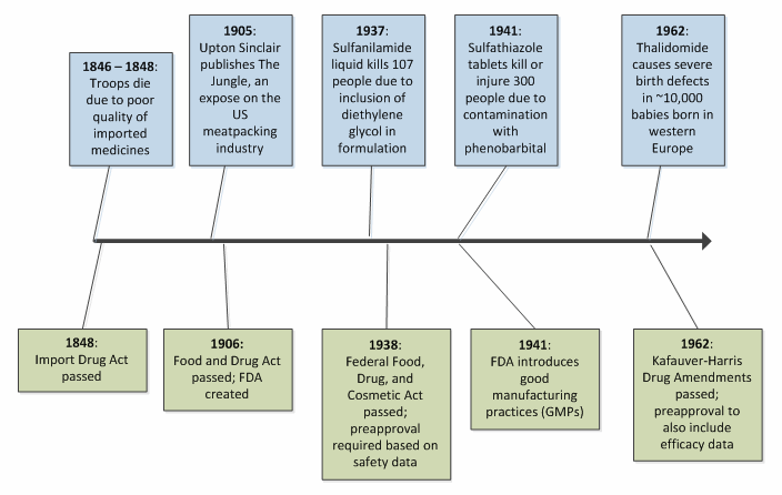 In the U.S., which represents the world’s largest population of drug consumers, the growth in both scope and statute of the FDA was borne of several highly publicized tragedies. Figure 1 illustrates this trend for selected early milestones in American drug law.2,3,4,5