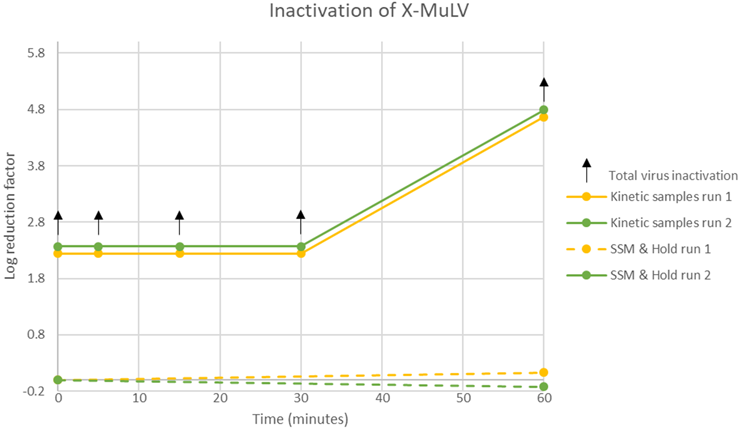It is important to understand that the T-0 time points (SSM & Hold Run 1 and SSM & Hold Run 2) show complete inactivation and therefore inactivation does not improve after 60 minutes. For the two T=60 kinetic samples, a higher volume was titrated in order to improve the LOD (limit of detection) of the assay and therefore yielded a higher reduction factor.