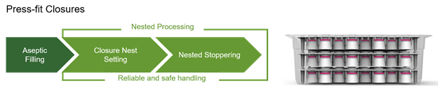 Press-fit vial closures, combined with the RTU nesting format, improves quality levels of the products manufactured. In addition to eliminating the need for crimping of aluminum caps, vibratory stopper bowls and tracks that are notorious sources of particulates, are eliminated from use in the isolator.