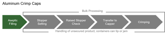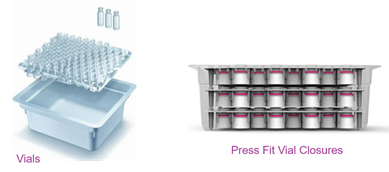Another important feature is the use of a press-fit vial closure system when using vials as drug product containers. This press-fit vial closure system allows the vials to be fully sealed within the ISO 5 environment and eliminates the particulate generated from typical aluminum crimping systems. These press-fit caps have been proven to pass all forms of CCIT.