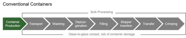 Other innovations, such as pre-sterilized components, have helped as well. Pre-fillable syringes (PFS) in nested tubs have been available for the past two decades and have become an industry standard. PFSs reduce in-house processes and equipment needs and simplifies the supply chain (see graphic below). In addition, the higher price of nested PFSs has been offset by the cost savings of reduced capital equipment and lower operating costs.